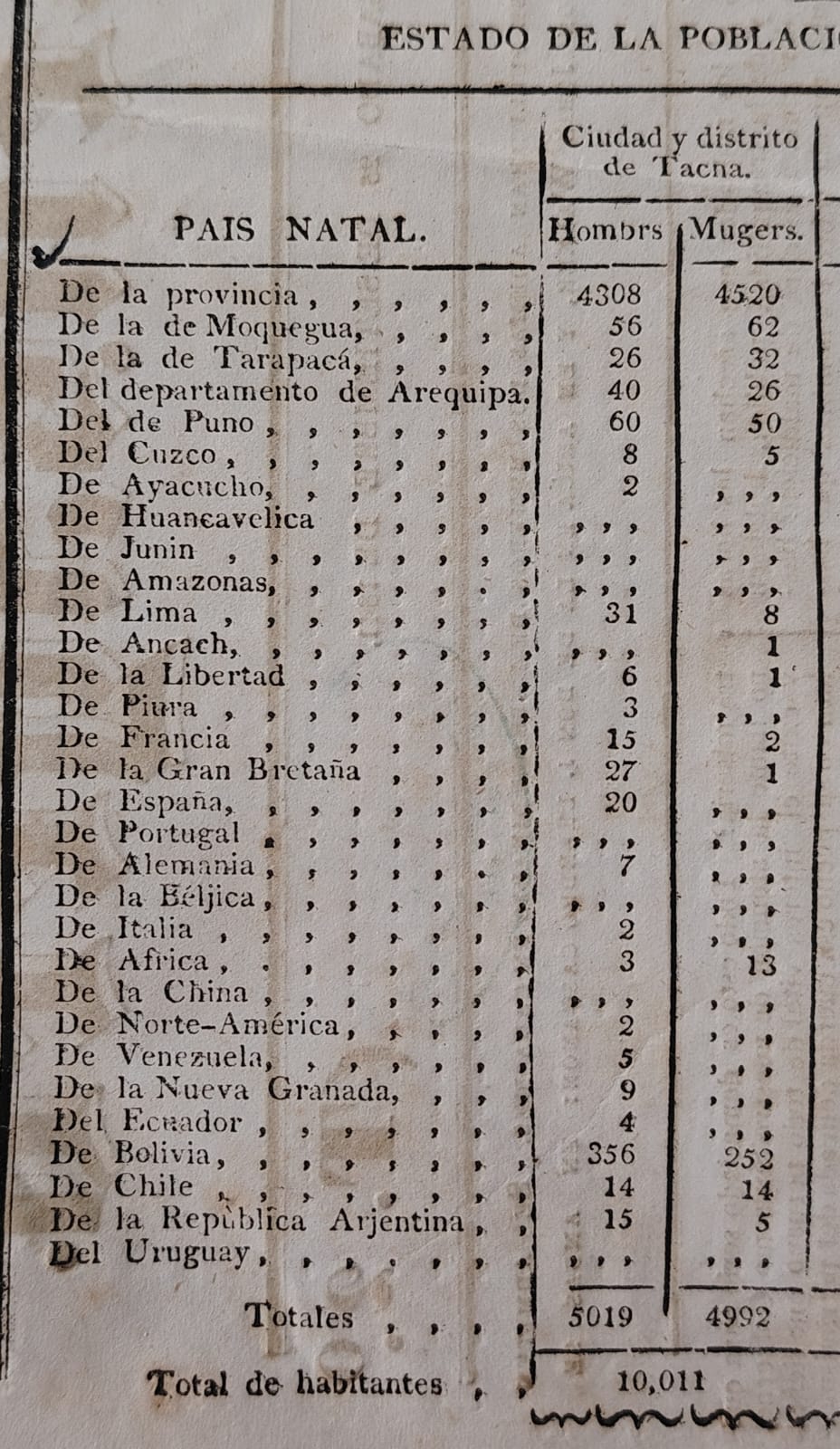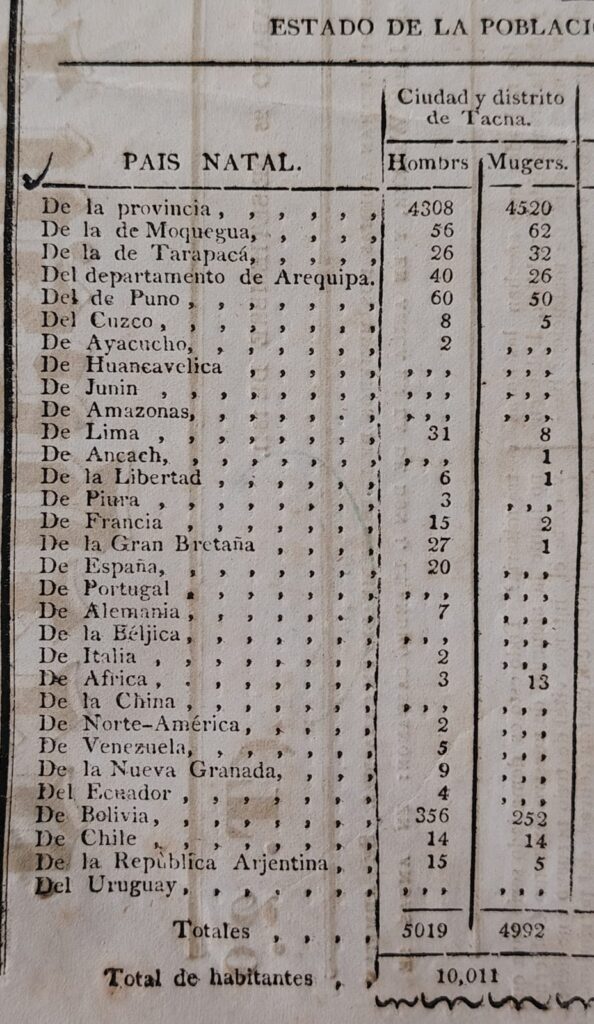De los 10, 011 habitantes que en 1840 tenía Tacna, nativos de esa provincia eran 4,308 personas; de Puno, 60; Moquegua, 46; de Arequipa, 40; de Lima, 31; de Tarapacá, 26; de Cuzco, 8. De lo extranjeros: 356, de Bolivia; 27, de Gran Bretaña; 20, de España; 15 de Francia; 15 de Argentina; 14 de Chile; Colombia, 9: También, Alemania, 7; Italia,2; Venezuela; 3; África, 3; Estados Unidos, 2. De otros territorios peruanos, y de otros países, ver cuadro en esta nota. Información corresponde al censo vigente a ese año, y publicado por la prensa de Tacna.