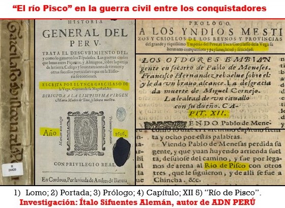 El título completo de esta obra de Garcilaso de la Vega, en la que figura mencionado el río Pisco en un suceso histórico de mitad del siglo XVI en los territorios de Ica, es “Historia General del Perú. Trata del descubrimiento del y como lo ganaron los Españoles. Las guerras civiles hay entre Pizarros y Almagros, sobre la partija de la tierra. Castigo y levantamiento de tiranos: y otros sucesos particulares que en la Historia se contienen”.