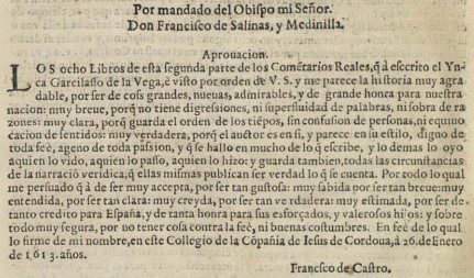 El 26 de enero de 1613, Francisco de Castro, del Colegio de la Compañía de Jesús de Córdoba, aprueba «los ocho libros de esta segunda parte de Comentarios Reales que ha escrito el Inca Garcilaso de la Vega».