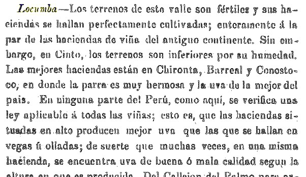 “Las mejores haciendas están en Chironta, Barreal y Conostoco, en donde la parra es muy hermosa y la uva de la mejor del país. En ninguna parte del Perú, como aquí, se verifica una ley aplicable a todas las viñas; esto es, que las haciendas situadas en alto producen mejor uva que las que se hallan en vegas u olladas; de suerte que muchas veces, en una misma hacienda, se encuentra uva de buena o mala calidad según la altura en que es producida. Del Callejón del Palmo para arriba la uva es buena”.
