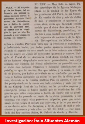 “Decís que habiendo tenido noticia que el doctor don Antonio Timoteo de Salvatierra, presbítero, había ido a esa ciudad de Lima con cierta provisión supuesta de racionero de la iglesia Metropolitana de México, diste orden a vuestro provisor para que la recogiese y examinase y habiéndolo hecho por todas partes aparecía sospechosa”.