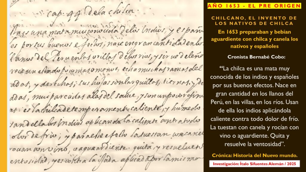 De 1653 data el manuscrito en el que el Pisco figura en la elaboración y consumo de una bebida creada tanto por nativos peruanos como por españoles. Tal como la Unesco reconoce, en 1587 se elaboraba en Perú un singular aguardiente de uva que, con los años, su nombre quechua Pisco empezó a tener mayor difusión, pero no se conocía a partir de qué año empezó a ser combinado con otros ingredientes para producir el primer cóctel originario. Un hallazgo en el 2025 permite conocer, 372 años después, que en esa bebida utilizaron la planta nativa llamada Chilca, la canela, y el aguardiente, es decir Pisco. Se trata de una bebida resultado del mestizaje, es la primera versión del cóctel llamado Chilcano, originario de Chilca, pueblo de nativos peruanos ubicado al sur de Lima. En este cóctel se combinan los productos del Viejo Mundo y del Nuevo Mundo.