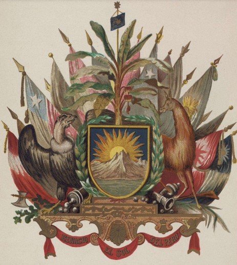 La imagen del primer escudo aparece en las monedas acuñadas en esos primeros años republicanos. Una palmera de plátano figura como símbolo sobre el escudo, así como un cóndor y una llama. “Renació el sol del Perú” es la frase que colocaron al pie del escudo, rodeado de ramas de laurel, flores y banderas de los nacientes estados sudamericanos, entre ellas la rojiblanca peruana. Los andes y el mar también destacan en la composición de este símbolo.